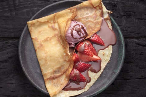 Schokolade * / Schokolade - frische Erdbeeren * oder Topfencrème - Waldbeeren * (saisonal) / Schokolade - Haselnusskrokant - Schlagobers * / Butter - Zucker, flambiert mit hausgem. Orangenliqueur * / Bratapfel- Caramel - Schlagobers, mit Calvados flambiert * / Caramel au beurre salé: hausgemachter Butter-Karamell nach bretonischem Rezept /Preis: Pro Stück à € 8.50